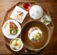먼저 배와 마에 꿀을 더해 만든 선식에 흑미팝콘과 민트의 가니쉬로 완성된 에피타이저가 준비되어 있습니다. 곁들임으로 대나무 새순과 새우가 만나 새콤하고 고소한 맛의 조화로움을 선사하는 새우죽순초무침과 함께, 다채로운 채소가 어우러진 수육오색무침은 각종 채소의 신선함은 수육의 풍미를 더해줍니다. 봄의 신선함을 담은 배추말이로 색감과 아삭함이 돋보이는 식감을 느끼고 난 뒤에는, 꽃으로 눈을, 찹쌀과 꿀로 입을 즐겁게 하는 전통 디저트인 화전으로 마무리 합니다.