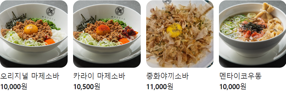 마제소바(まぜそば)의 이름은 일본어 마제루(まぜる)의 '섞다' '비비다'라는 뜻에서 붙여진 일본식 비빔라멘입니다. 마제소바는 잘 삶아진 면에 '마제야'만의 감칠맛 나는 특제소스를 넣고 고기, 야채, 계란노른자등 다양한 고명을 올려서 비벼 먹는 특별한 면요리입니다. - 마제야는 -재래식 무방부제 생면을 사용합니다. -마제소바에 들어가는 간장(타래), 향신유, 라유, 챠슈, 소스, 양념, 육수등 모든 재료는 일본전통방식으로 매장에서 직접 만들며 시판되는 프랜차이즈 완제품소스, 반조리식품, 냉동면 등은 절대 사용하지 않습니다.